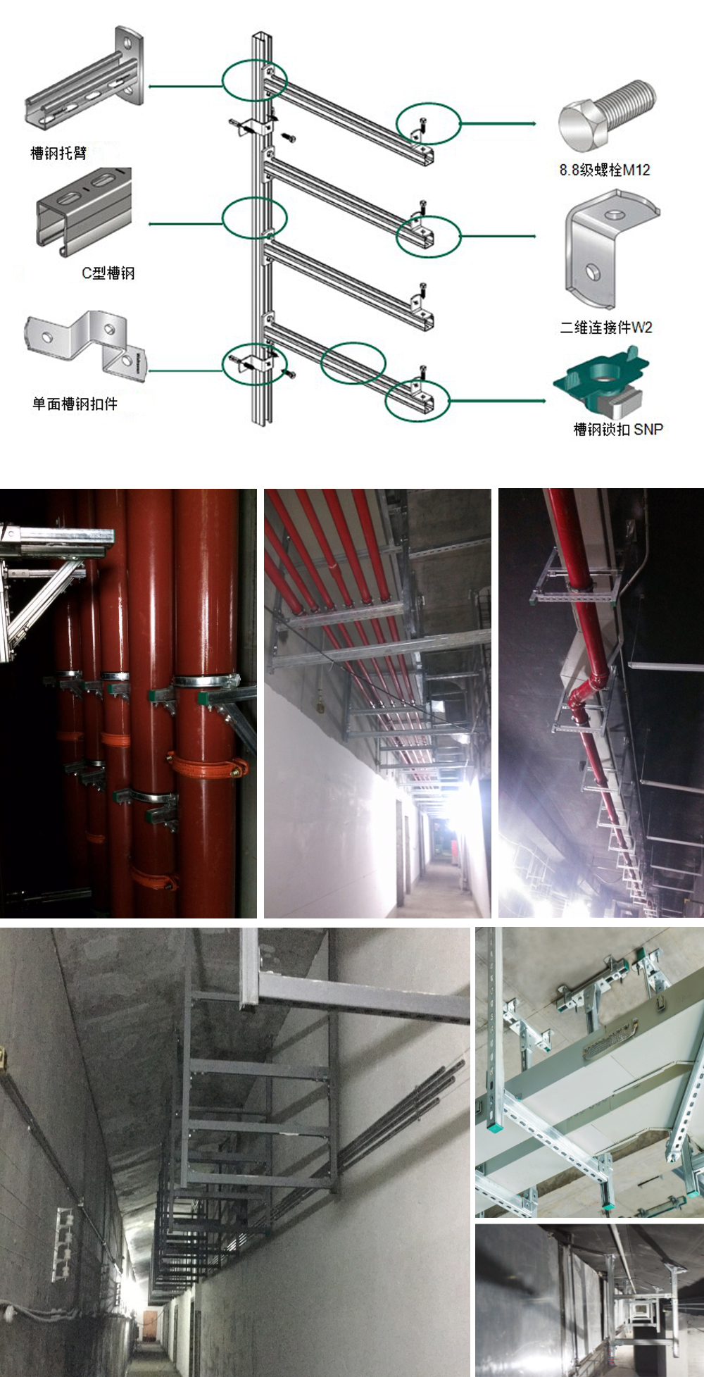 ●适用于安装电缆、通风管道和一般轻型管道●底座CO2焊接,确保承载高荷载能力●底座椭圆孔设计方便安装时调节●轴向加劲肋设计增加抗弯能力●卷边带有锯齿,与其他配件精密咬合,有效抗剪、止滑、抗冲击●表面有辅助标距,方便安装时现场加工●背面条形安装孔,易于调节安装●材料:槽钢按照DIN EN 1002-2标准生产;底板按照DIN EN 10149-2生产管廊支架、抗震支架横梁托臂