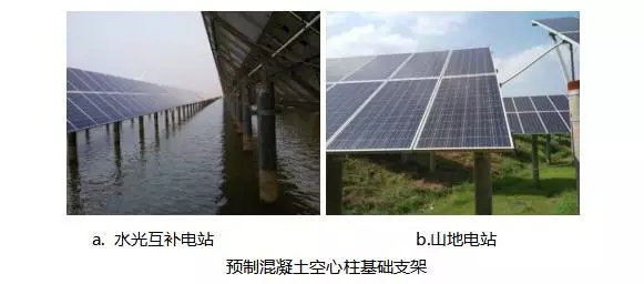 预制混凝土空心柱基础广泛用于水光互补电站、滩涂地电站等地质条件较差的电站。同时由于基础高度优势,也被较多用于山地电站以及农光互补电站。